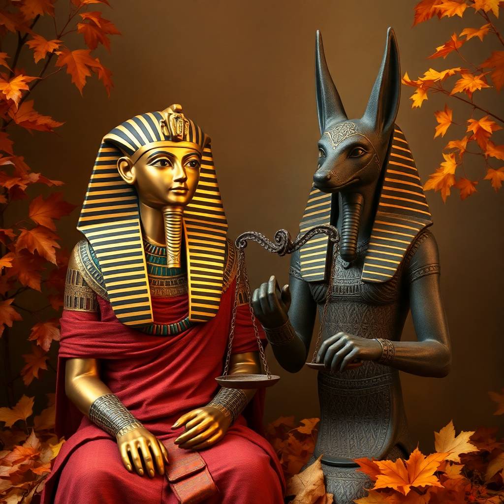 You are brought into the Hall of Two Truths, where the heart is weighed against the feather of Maβat β truth, balance, and right-order. On one scale sits your heart: the record of your life, heavy with choices, words, and deeds. On the other sits the feather.